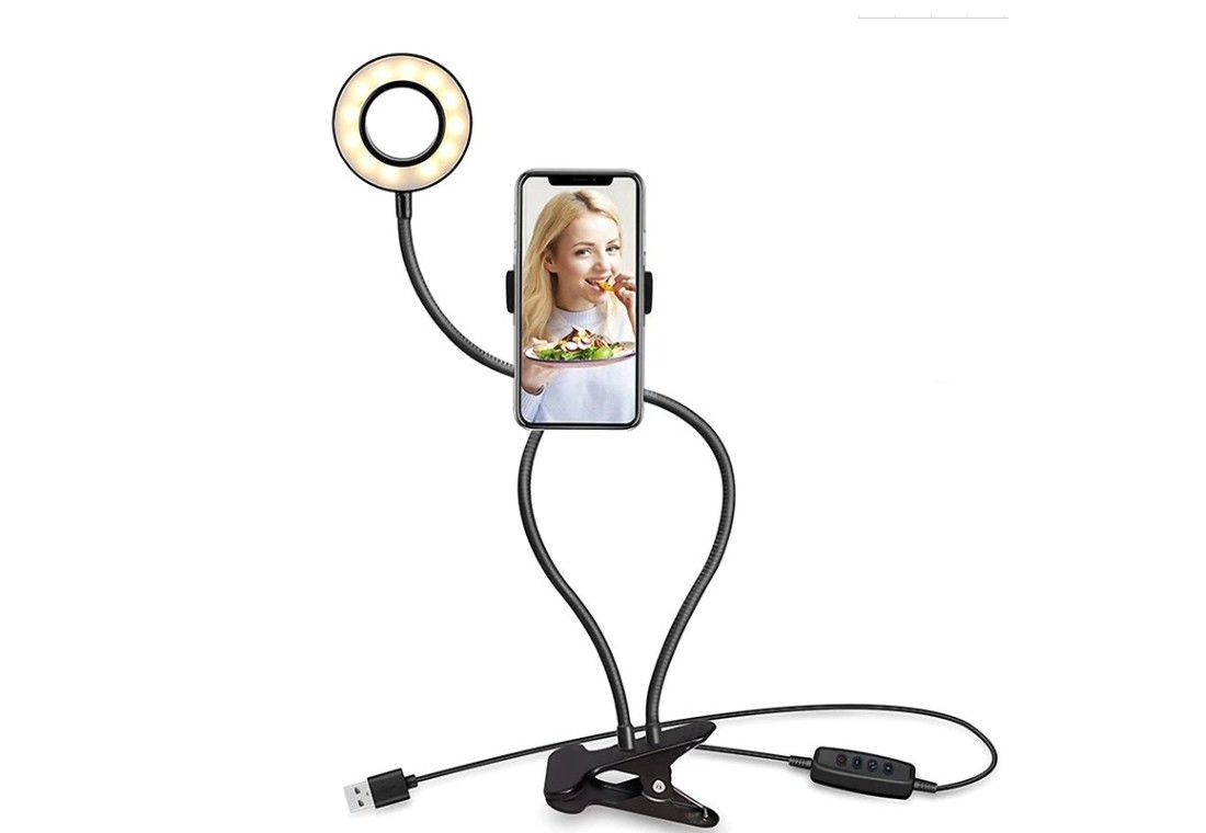2. La luz del anillo del clip del escritorio se puede ajustar a cualquier ángulo y no se hundirá abajo con el teléfono. Y tiene otro brazo de la pulgada con el tenedor del teléfono, el tenedor del teléfono puede ser extendido a 3,5" ancho, conveniente para la mayor parte de los teléfonos elegantes